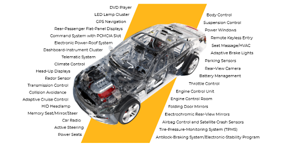 From engine management systems (fuel injection rate, emissions control, cooling systems) and autonomous controls (lane, speed, park assist, adaptive cruise control) to infotainment systems and comfort systems (climate control, electronic seat adjustment, automatic wipers, etc.), the modern-day gas-powered and electric vehicles have more electronic devices than ever. Indeed, the microprocessors and chips that power modern vehicles are now so prevalent that they’re practically a commodity in the same vein as steel and aluminum.