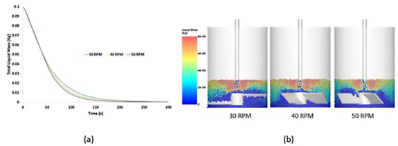 Liquid drying is simulated using the Liquid Drying by Heat Flux solver module in Rocky, which enables users to model liquid film evaporation due to the latent heat. Figure 1 shows the liquid drying curves at different agitation speeds and a snapshot of particles in the center plane colored by the liquid mass after 60 seconds.