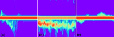 Example Doppler spectrograms for activities (a) falling, (b) walking, and (c) standing. Doppler frequency on the vertical axis and time on the horizontal axis.