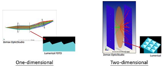 Figure 1. Ansys Lumerical and the Lumerical Finite-Difference Time-Domain (FDTD) can analyze 2D and 1D diffractive gratings, respectively, and coordinate parameter data with Ansys Zemax OpticStudio for ray tracing calculations.