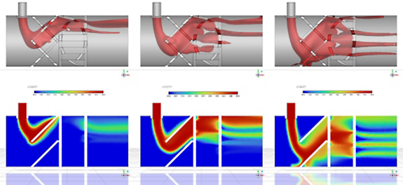 Figure 1. Temperature distribution within a static mixer parametrically studied as a function of side inlet mass flow change. Isosurface based on average temperature (top), temperature contours (bottom).