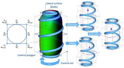 Using a variable number of control points and the corresponding number of coils enables the multi-coiling of the coil spring on the cylindrical body. In this scenario, both the first and last control points are fixed, while others can move freely within the UV plane. The degree of the NURBs curve impacts the local influence of the control point of the coil on the coil spring geometry.