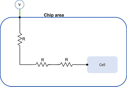 Voltage drop due to parasitic resistance in the interconnect between supply pin and the cell.