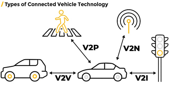 Some examples of the various types of connected vehicle technology responsible for on-road interactions, namely vehicle to vehicle (V2V), vehicle to pedestrian (V2P), vehicle to network (V2N) and vehicle to infrastructure (V2I).