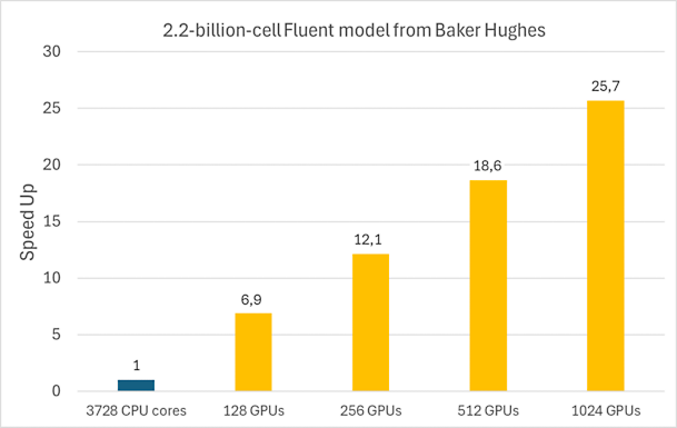 When comparing this to methods that utilize over 3,700 CPU cores, Baker Hughes and Ansys reduced the overall simulation run time from 38.5 hours to just 1.5 hours using 1,024 AMD Instinct MI250X GPUs.
