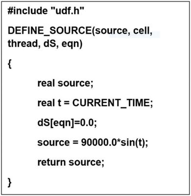UDFs can get complicated quick. For instance, Figure 1 shows you the Fluent UDF code required to set up a sinusoidally fluctuating heat source based on the function Energy(t) = 90000*sin(t) [W/m^3].