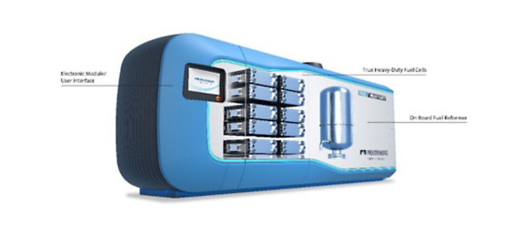 Their innovative concept for more independency from fossil fuels for the heavy-duty industry comes in the form of a compact onboard chemical plant: a hydrogen-generation module that converts methane or methanol to supply hydrogen to a stack of low-temperature polymer-electrolyte membrane fuel cells (PEMFC). A single system produces a net output of 500 kW of electricity and multiple systems can be combined to meet the ship’s energy demands.