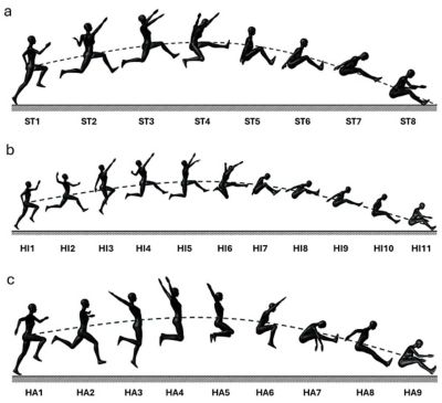 - Stride: Jumpers lift one of their legs into a toe-touching position after takeoff.