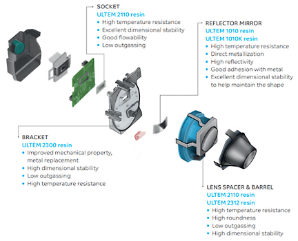 SABIC’s ULTEM resin addresses high temperature design requirements (up to 230°C) for digital matrix headlights. Additionally, the material’s dimensional stability and low outgassing performance are comparable to metal and glass solutions, but at a lower weight. Potential digital matrix LED headlight applications include the lens barrels, spacers, brackets, reflector mirrors, and digital micromirror device (DMD) sockets.