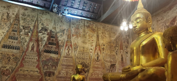 Murals were popular in the ancient Thai royal palace. One example is the wall painting at Wat Ko Kaeo Suttharam in Phetchaburi, which dates back to the 18th century. Although the pigments used in the mural can last for long periods of time, an accumulation of humidity can lead to deterioration.
