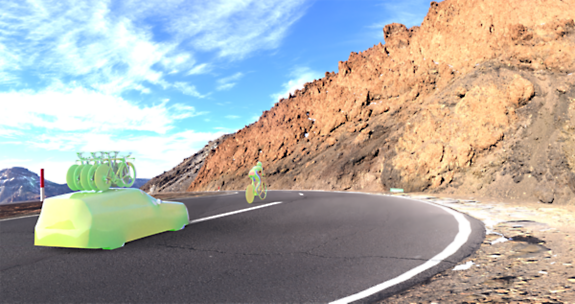 We already know that a team car riding behind a cyclist gives the athlete an aerodynamic benefit. This physical insight was revealed in an earlier study by the same partners in 2015.1 The effect can be explained by the air mass that is pushed forward by the car body, as shown in the videos below. This generates a large overpressure bubble in front of the car (see red and yellow colors), which in turn exerts a significant push effect on the cyclist and allows him/her to ride faster with the same effort. In 2023, the International Cycling Union (UCI), after consulting with the researchers and others, changed the previous minimum distance between the cyclist and following team car from 10 m (32.8 feet) to 25 m (82 feet). However, a lack of proper measurement technology makes it difficult to actually enforce the minimum distance rules. Moreover, the 2015 study did not consider the potential benefit of bicycles stacked on the roof of the following car. To the best of our knowledge, no one has ever assessed in detail how much drag reduction is caused by different numbers and configurations of roof-top bicycles.